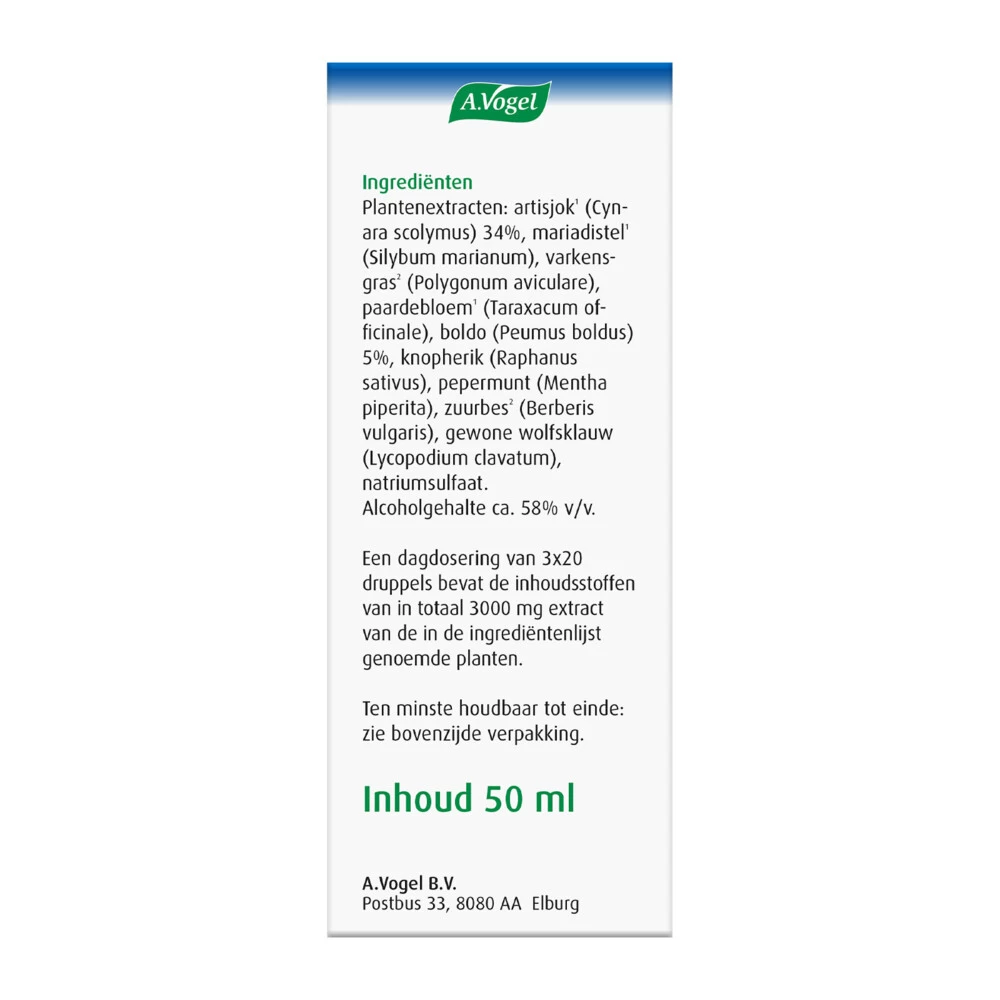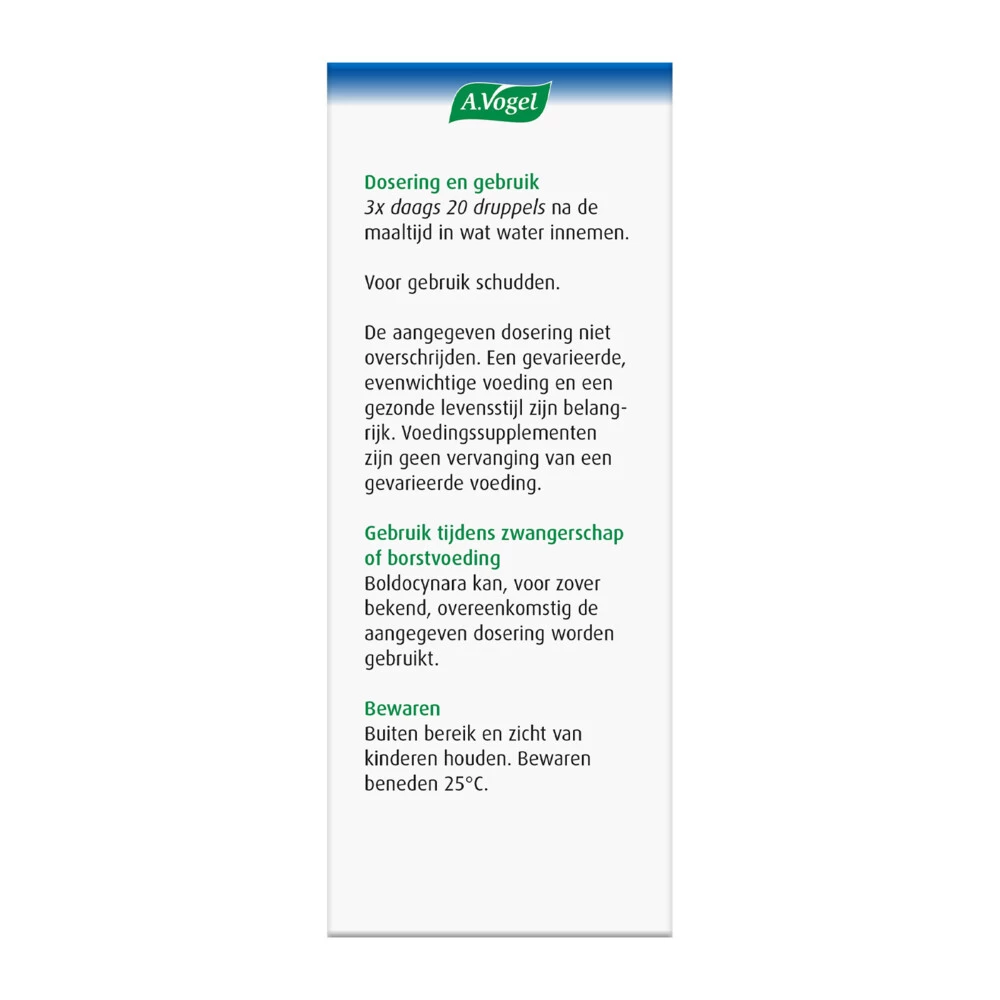 A.Vogel Boldocynara Druppels De Boldocynara Druppels van A.Vogel is een voedingssupplement en kruidenpreparaat dat goed is voor de lever* en de spijsvertering. Boldocynara druppels bevat de extracten van Artisjok, Mariadistel, Paardenbloem, Zuurbes en Varkensgras. Artisjok, Mariadistel en Paardenbloem ondersteunen de reinigende werking van de lever. Tevens ondersteunt Paardenbloem het functioneren van de maag en tenslotte zijn Zuurbes en Varkensgras goed voor de spijsvertering in de maag en