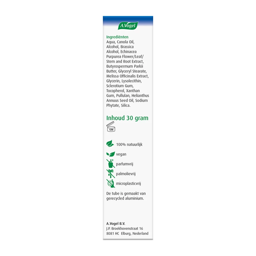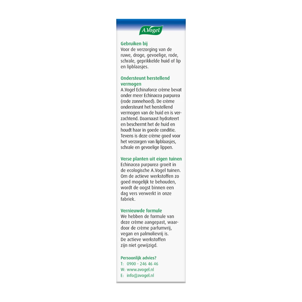 A.Vogel Crème EchinaforceA.Vogel Crème Echinaforce is een cosmetische crème. Crème Echinaforce bevat onder meer Echinacea purpurea (rode zonnehoed). Echinaforce crème ondersteunt het herstellend vermogen van de huid. Daarnaast verzorgt hydrateert en beschermt Crème Echinaforce de huid en houdt de huid in goede conditie. Crème Echinaforce is ideaal bij gevoelige of geprikkelde plekjes op huid of lippen.Verzorgt en verzacht een droge en gevoel