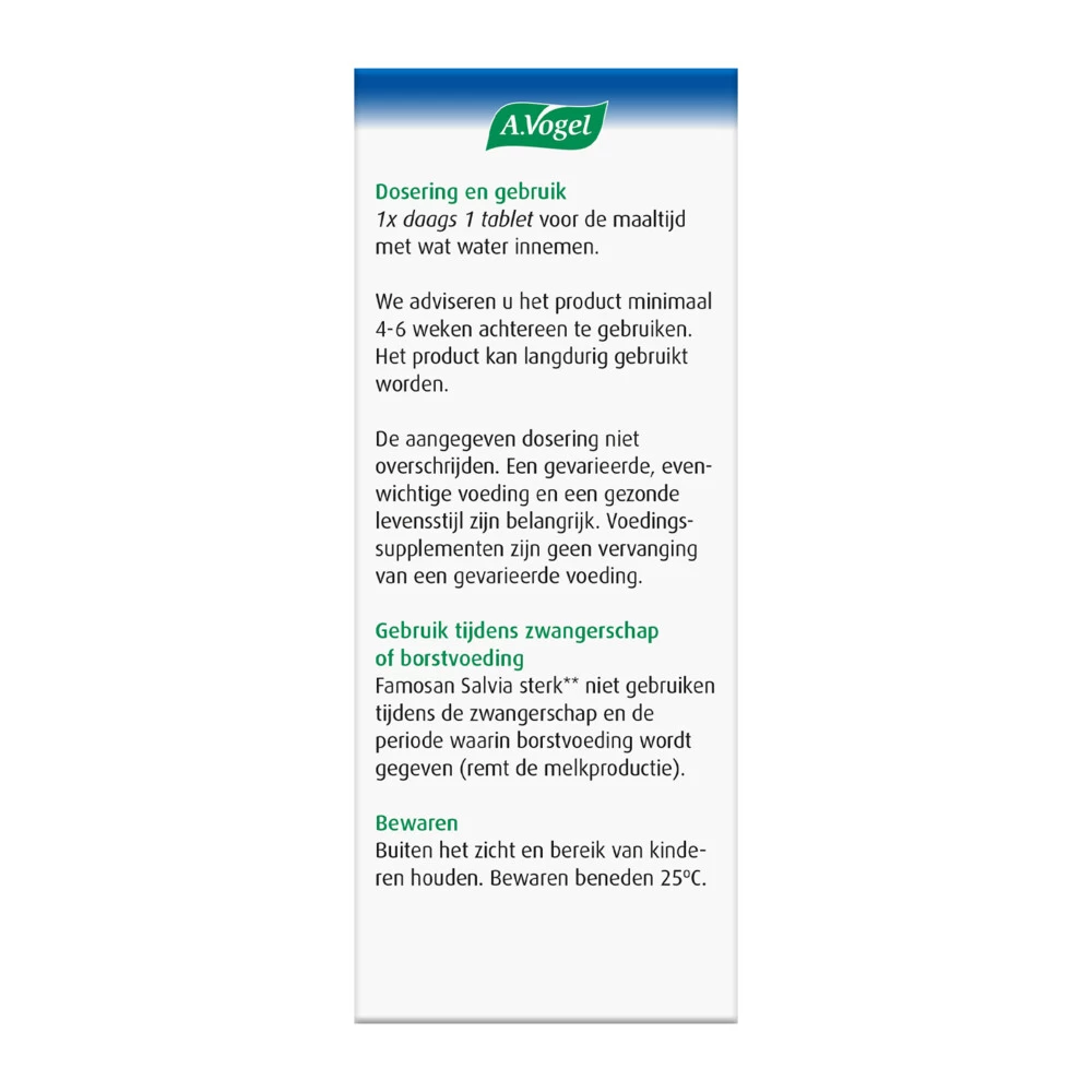Famosan Salvia Sterk** OvergangFamosan Salvia Sterk** van A.Vogel is een krachtige** ondersteunt het natuurlijk overgangsproces1* Famosan Salvia Sterk** bevat Salvia officinalis dat helpt bij de overgangssymptomen zoals opvliegers, zweten en nachtzweten* (nachtelijk transpireren). Door zijn krachtige formule heb je maar 1 tablet per dag nodig en werkt het snel.Ondersteunt het natuurlijk overgangsproces1*Helpt bij opvliegers, zweten en nachtelijk transpireren*Krachtige** formuleSlechts 1 tablet p