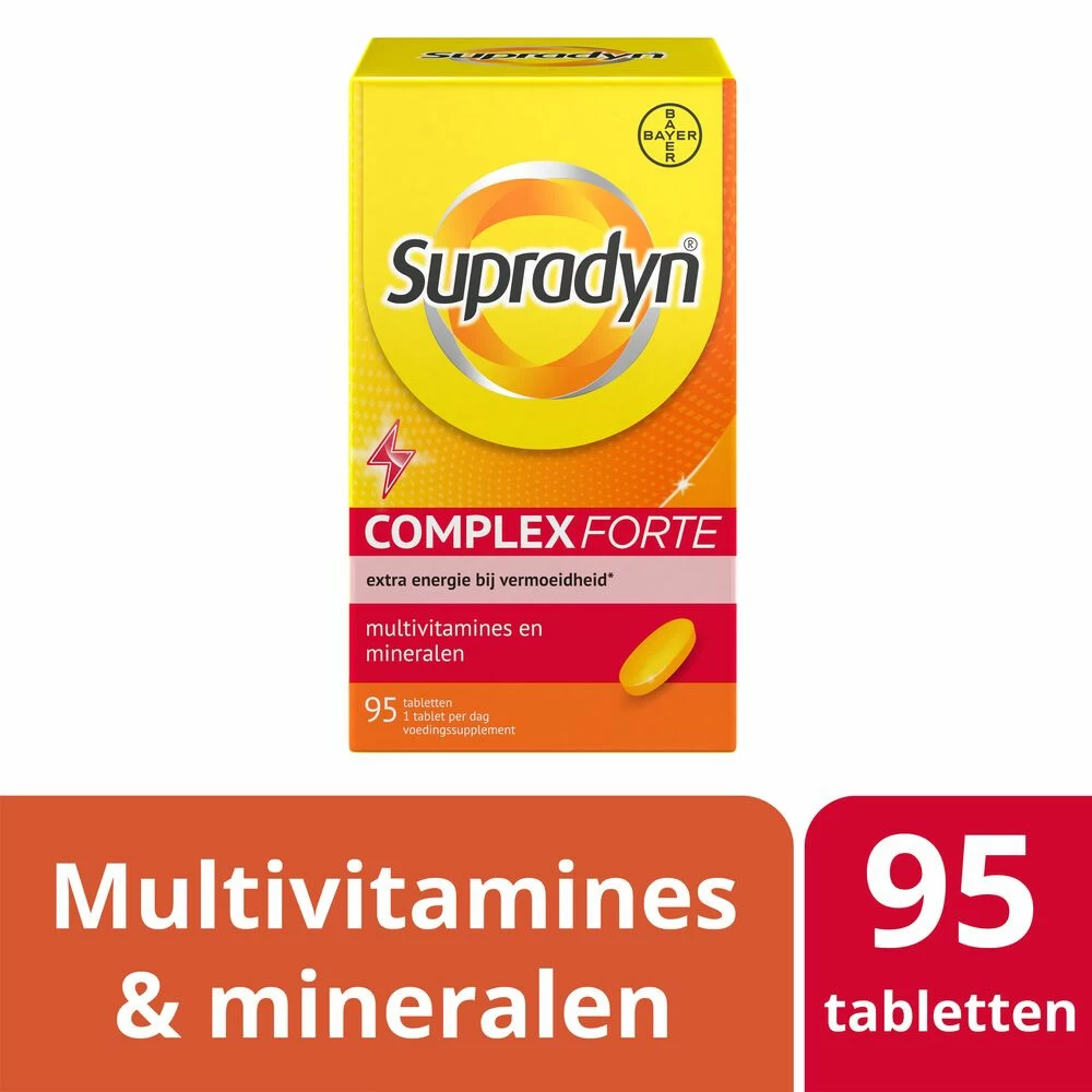 Supradyn Complex ForteSupradyn Complex Forte geeft je als aanvulling op de voeding extra vitamines in periodes waarin je extra energie bij vermoeidheid* goed kunt gebruiken.Extra energie bij vermoeidheid*Ondersteuning tijdens veeleisende periodes**Hooggedoseerde multivitamines en mineralen***22 vitamines en mineralenDe bruistabletten zijn gemakkelijk op te lossen in een glas water*De vitamines B2, B3, B5, B6, B12, C, het mineraal magnesium en het sporenelement ijzer activeren extra energie bij v