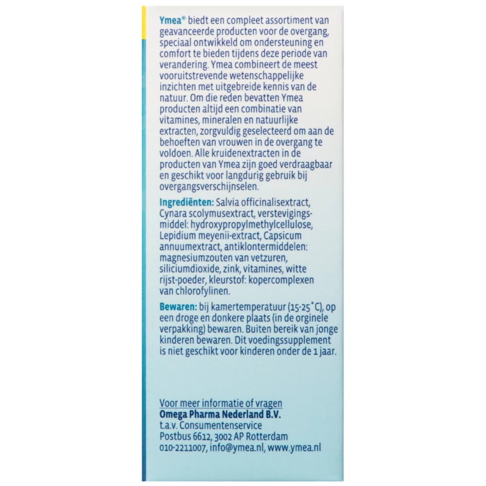 Ymea 8 in 1 capsulesDe vegetarische capsules van Ymea 8 in 1 overgangscapsules ondersteunt je lichaam bij de acht meest voorkomende overgangs verschijnselen te weten: Opvliegers, Nachtelijk transpireren, Stemmingswisselingen, Vermoeidheid, Gewichtsverlies, Spijsvertering, Behoud sterke huid, haar & nagels, Behoud sterke botten & spieren.De unieke samenstelling van Ymea 8-in-1 Overgang kenmerkt zich door de volgende ingrediënten:Salie: helpt bij opvliegers en nachtelijk transpireren*