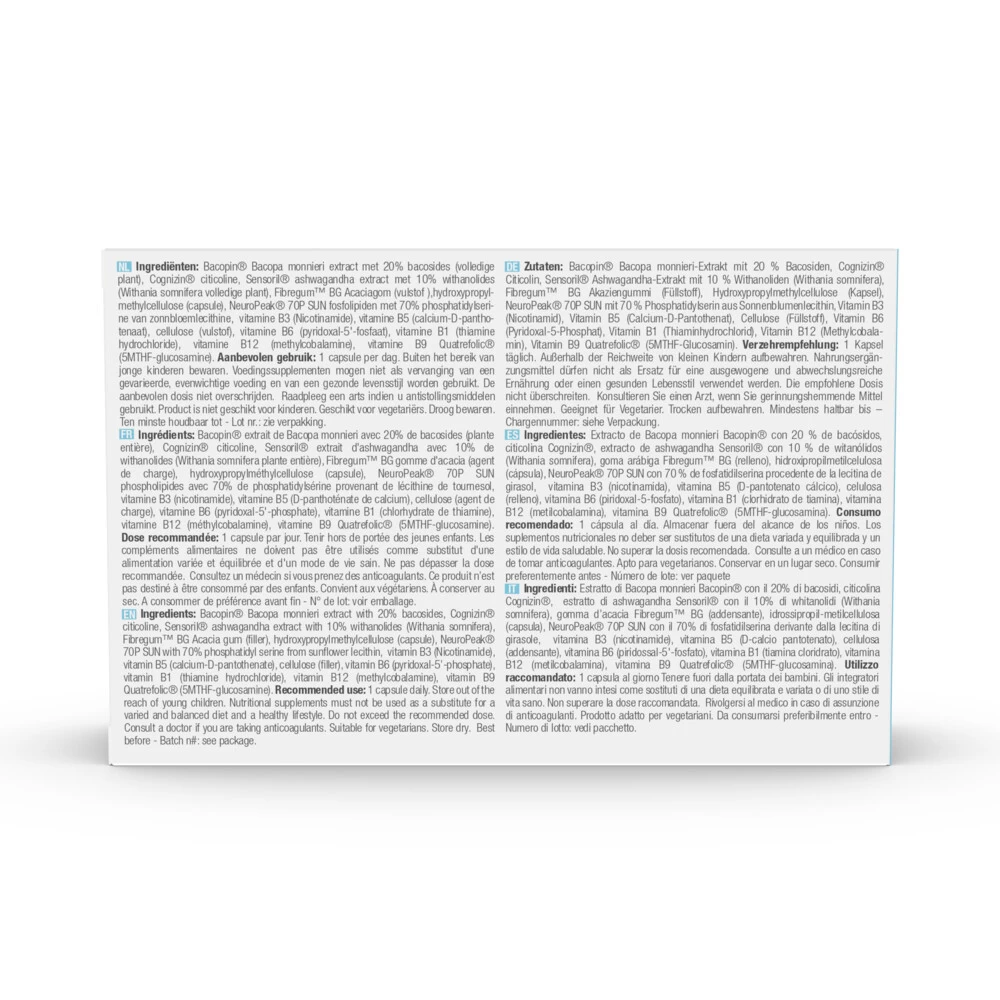 Purasana PuraBrainPurasana PuraBrain is een plantaardig kruidenpreparaat dat speciaal is geformuleerd om de brein te helpen ondersteunen. Naast de kruiden Bacopa en Ashwagandha bevat dit voedingssupplement ook Vitamine B1, B3, B5, B6, B9 en B12. Vitamine B6 en B12 dragen bij aan de vermindering van vermoeidheid. Ook draagt Vitamine B12 bij tot de normale werking van het zenuwstelsel en een normale psychologische functie. Daarnaast ondersteunt Vitamine B6 de regulering van de hormonale activiteit