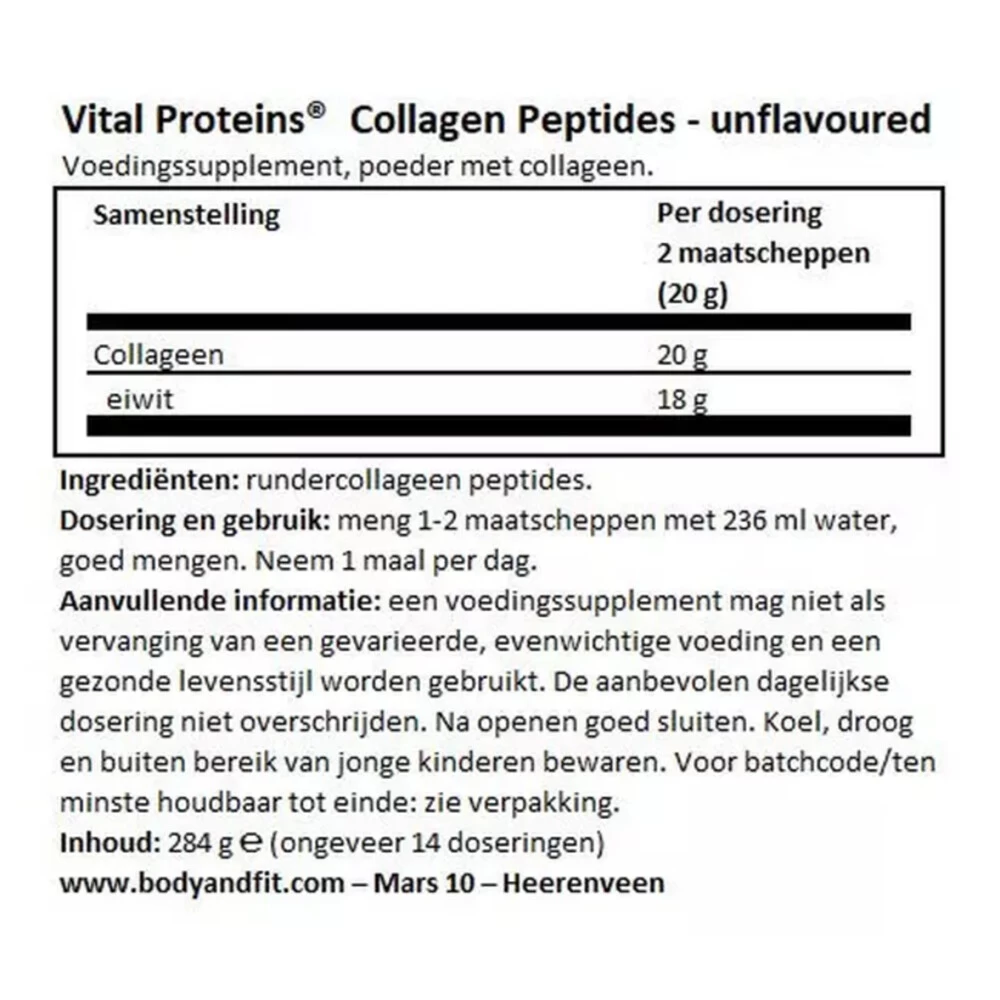 Vital Proteins Collageen PeptidenCollageen Peptiden van Vital Proteins is een niet-gearomatiseerd poeder dat per portie bomvol 20 g hoogwaardige collageenpeptiden van runderen zit. Deze verpakking bevat 567 gram hoogwaardige collageenpeptiden van runderen. Collageen is een belangrijk eiwit dat aanwezig is in al onze bindweefsels, pezen, ligamenten en botten met als doel om deze lichaamsdelen hun kracht, structuur en elasticiteit te geven. Collageen ondersteunt een gezonde huid, nagels en ha