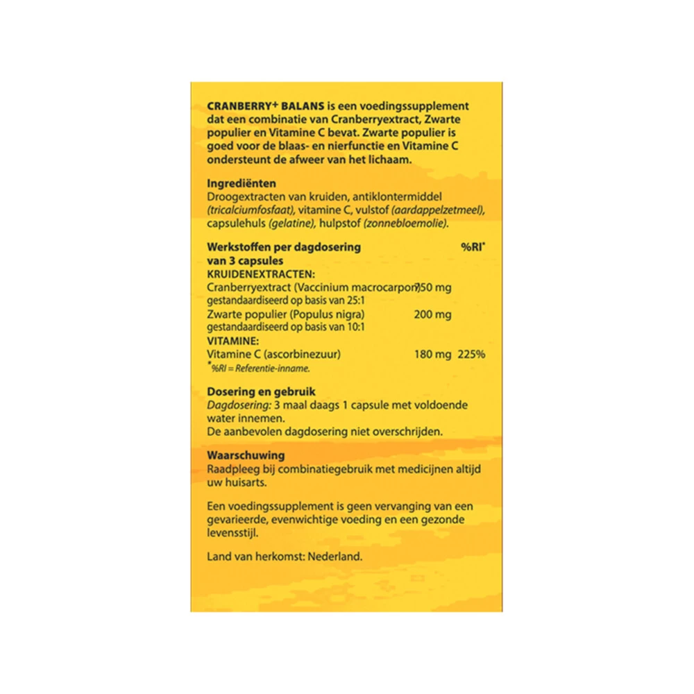 Bloem Cranberry+ BalansBloem Cranberry+ Balans is een voedingssupplement op basis van kruiden. Dit supplement bevat naast cranberryextract ook zwarte populier en vitamine C. Zwarte populier ondersteunt de blaasfunctie* en Vitamine C ondersteunt de afweer van het lichaam.Zwarte populier: Goed voor de blaas* en nierfunctie*Vitamine C: Ondersteunt de afweer van het lichaam* = Gezondheidsclaim in afwachting van goedkeuring door de Europese Commissie