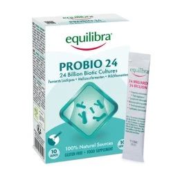 Equilibra 24 Billions ProbioticsEquilibra Probio 24 is een voedingssupplement op basis van 5 verschillende stammen melkfermenten die bijdragen aan het evenwicht van de darmflora. De darmflora is het geheel van bacteriën dat in de menselijke darm leeft. Elk deel van de darm wordt gekoloniseerd door specifieke klassen van deze bacteriën.Op basis van 5 verschillende melkzuurfermenten.Dankzij de oplosbare formule is Equilibra Probio 24 praktisch en aangenaam om in te nemenGeschikt vo