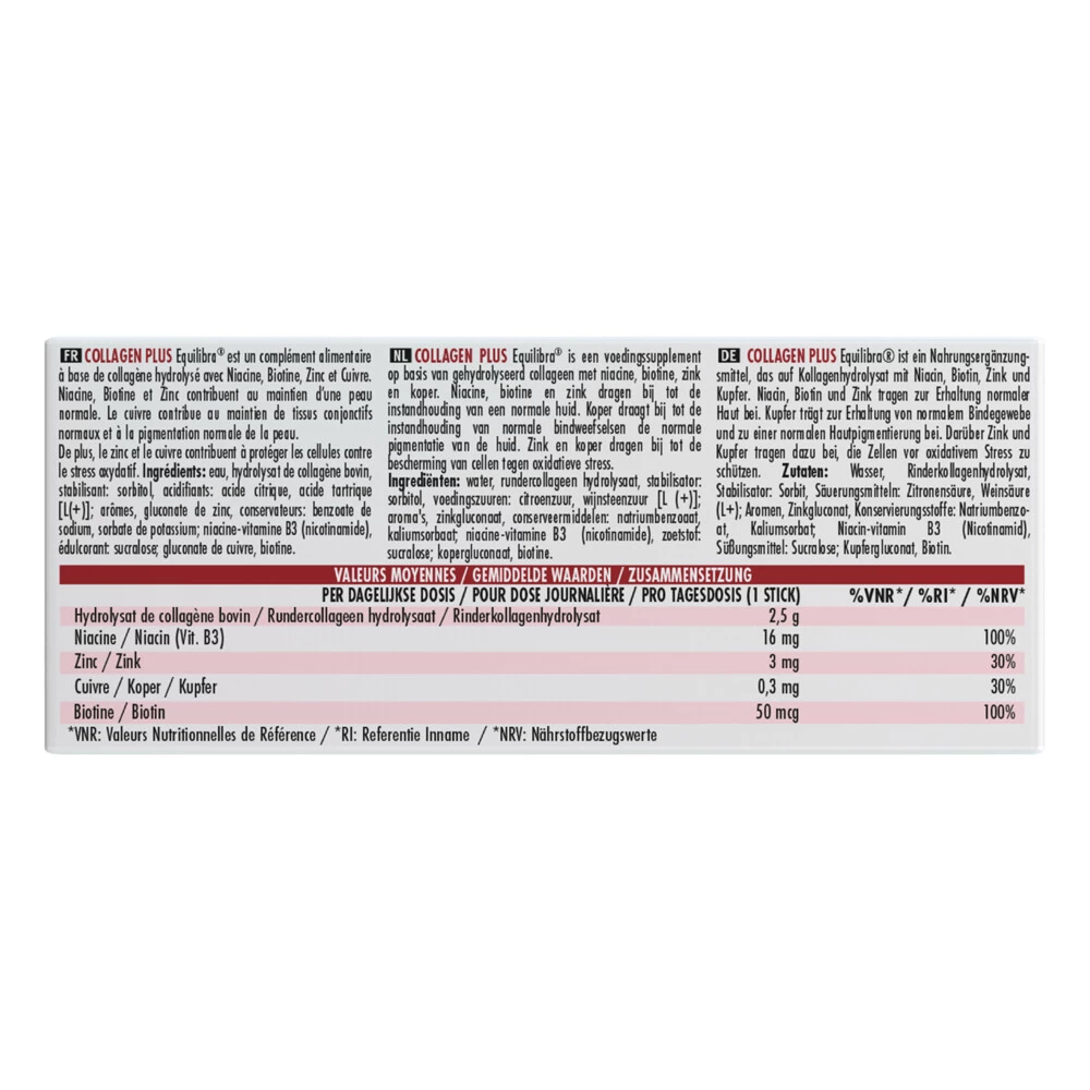 Equilibra Collagen PlusEquilibra Collagen Plus is een voedingssupplement op basis van gehydrolyseerd rundercollageen met Niacine en Biotine in combinatie met Zink en Koper. Gehydrolyseerd collageen in Collageen Plus wordt snel geabsorbeerd in het maagdarmkanaal. Vervolgens wordt het gedistribueerd en geaccumuleerd in de u0022doelweefselsu0022. Het is licht verteerbaar en wordt makkelijk verdragen. Niacine, biotine en zink dragen bij aan de instandhouding van een normale huid. Koper d