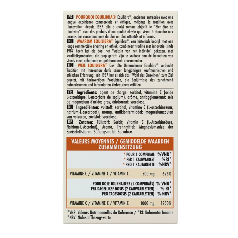 Equilibra Vitamin C met 500 mg Vitamine CVitamine C 500 mg van Equilibra is een voedingssupplement op basis van vitamine C. De kauwtabletten hebben een aangename sinaasapplesmaak, ze zijn gemakkelijk in te nemen zonder water en handig wanneer voor onderweg. Ze maken het ook mogelijk om een sterk geconcentreerd, specifiek gedoseerd product te krijgen.Vitamine C heeft vele weldadige effecten op je gezondheid en je welzijn.Draagt bij aan de normale werking van het immuunsysteemDraagt bij aan de bes