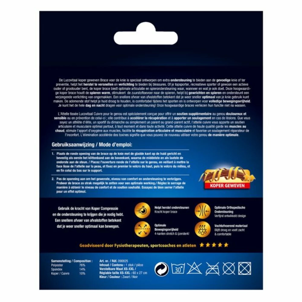 Lucovitaal Brace Knie KoperLucovitaal Brace Knie Koper is speciaal ontworpen om extra ondersteuning te bieden aan de gevoelige knie of ter preventie, helpt het herstel te versnellen en verlichting te bieden bij blessures. Deze hoogwaardige koper brace houdt de spieren warm, stimuleert de zuurstoftoevoer naar de spieren. Een snellere afvoer van afvalstoffen betekent dat je weer sneller optimaal van je knie gebruik kunt maken. De ademende stof helpt je huid droog te houden, is comfortabel tijdens