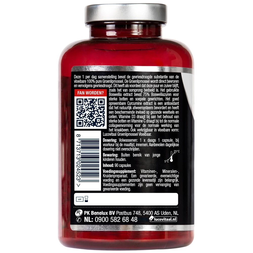 Lucovitaal Groenlipmossel ComplexGroenlipmossel complex van Lucovitaal bevat de gevriesdroogde substantie van de vloeibare 100% pure Groenlipmossel. De Groenlipmossel wordt direct bevroren en vervolgens gevriesdroogd. Dit heeft als voordeel dat deze puur en zuiver blijft, zoals het van oorsprong bedoeld is.Het gebruikte Boswellia extract bevat 75% Boswelliazuren voor sterke botten en soepele gewrichten. Het goed opneembare Curcumine extract is een antioxidant dat het natuurlijk afweersysteem bev
