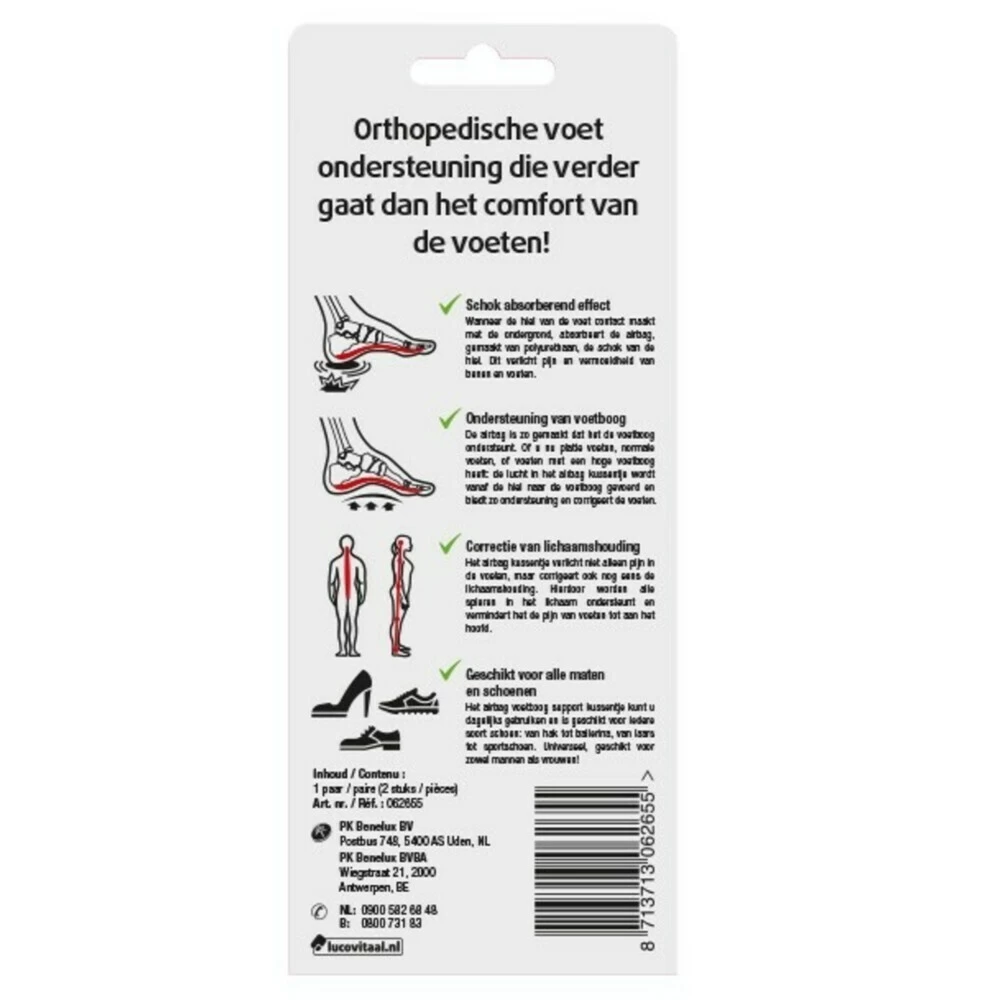 Orthopedische Voet OndersteuningDe Orthopedische Voet Ondersteuning (Airbags) van Lucovitaal is geschikt voor iedere soort schoen en alle maten. De Orthopedische Voet Ondersteuning (Airbags) van Lucovitaal gaat verder dan het comfort aan de voeten. De airbag is zo gemaakt dat het de voetboog ondersteunt, ook bij platte voeten en voeten met een hoge voetboog. De airbag verlicht pijn en corrigeert de lichaamshouding.Gemaakt van sterk, lichtgewicht materiaal (polyurethaan) dat jaren mee gaatSchok a