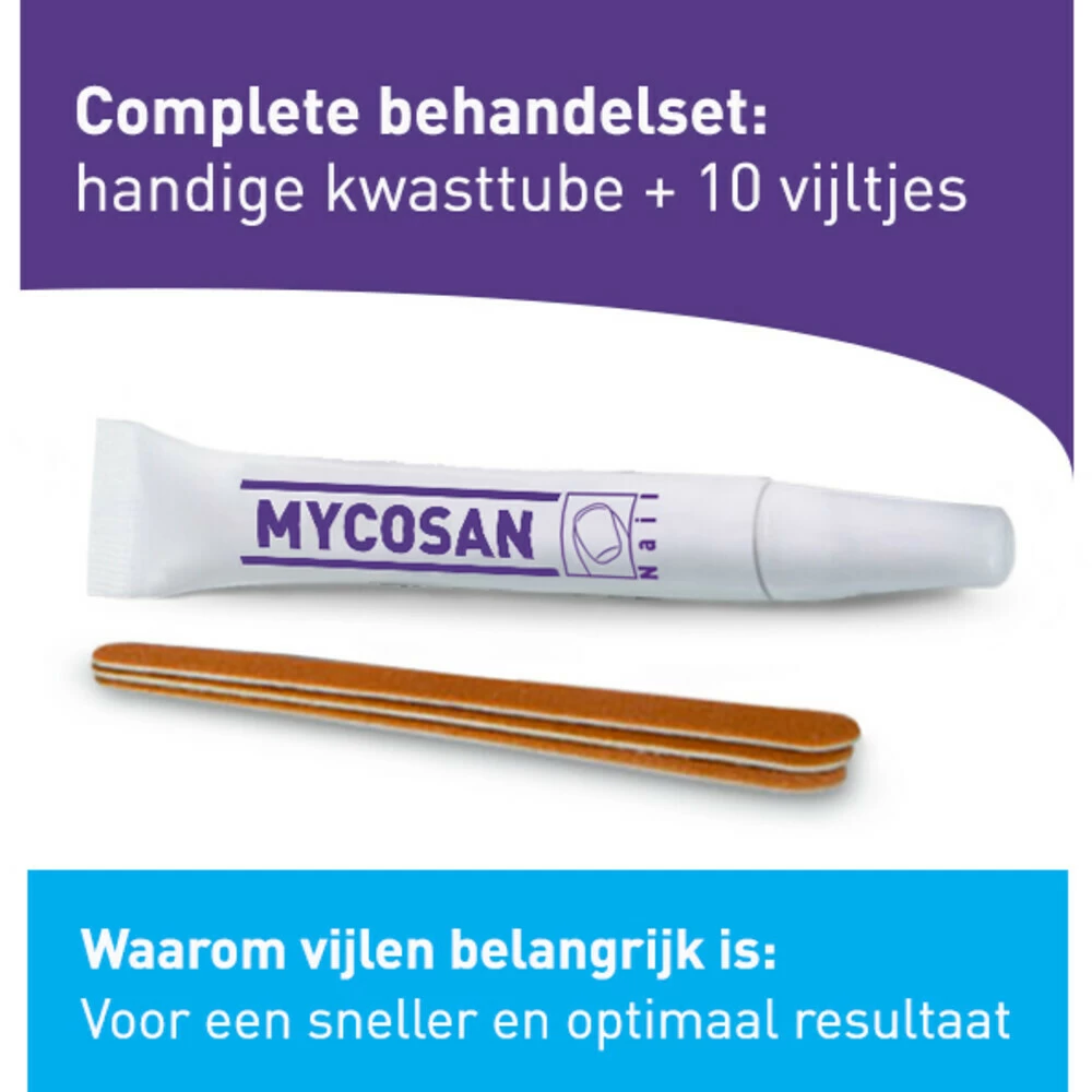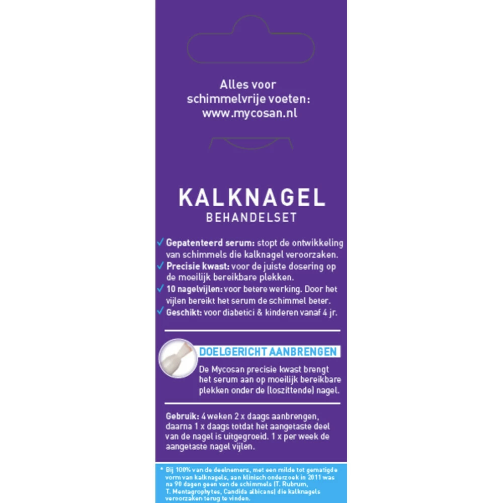 Mycosan Kalknagel Behandelset 5 mlDe Mycosan Kalknagel Behandelset is klinisch bewezen tot 100% effectief tegen schimmels die kalknagel veroorzaken met zichtbaar resultaat binnen twee weken. Mycosan Kalknagel Behandelset heeft een drievoudige werking: Het is een effectieve doelgerichte werkingHet dringt door in de nagel en herstelt de natuurlijke staat van de nagelVoorkomt (her-)besmetting door de vorming van een beschermend laagjeDe behandeling is gebaseerd op een gepatenteerd serum dat klinisc