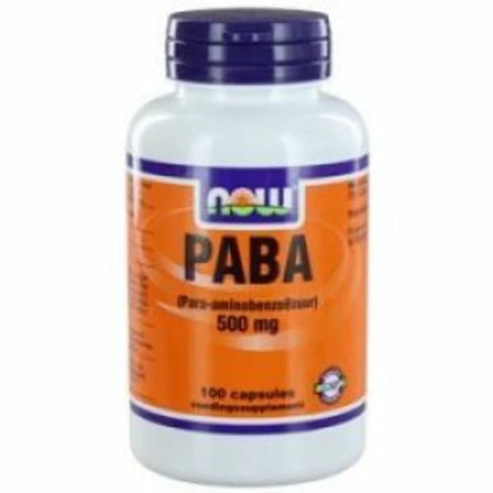 NOW PABA NOW PABA 500mg Capsules (para-aminobenzoëzuur) is een niet-eiwitaminozuur, dat voorkomt is voedingsmiddelen als tarwekiemen, lever, nieren eieren, yoghurt, zemelen en melk. De ca[psules van Now bevatten een hooggedoseerde PABA.