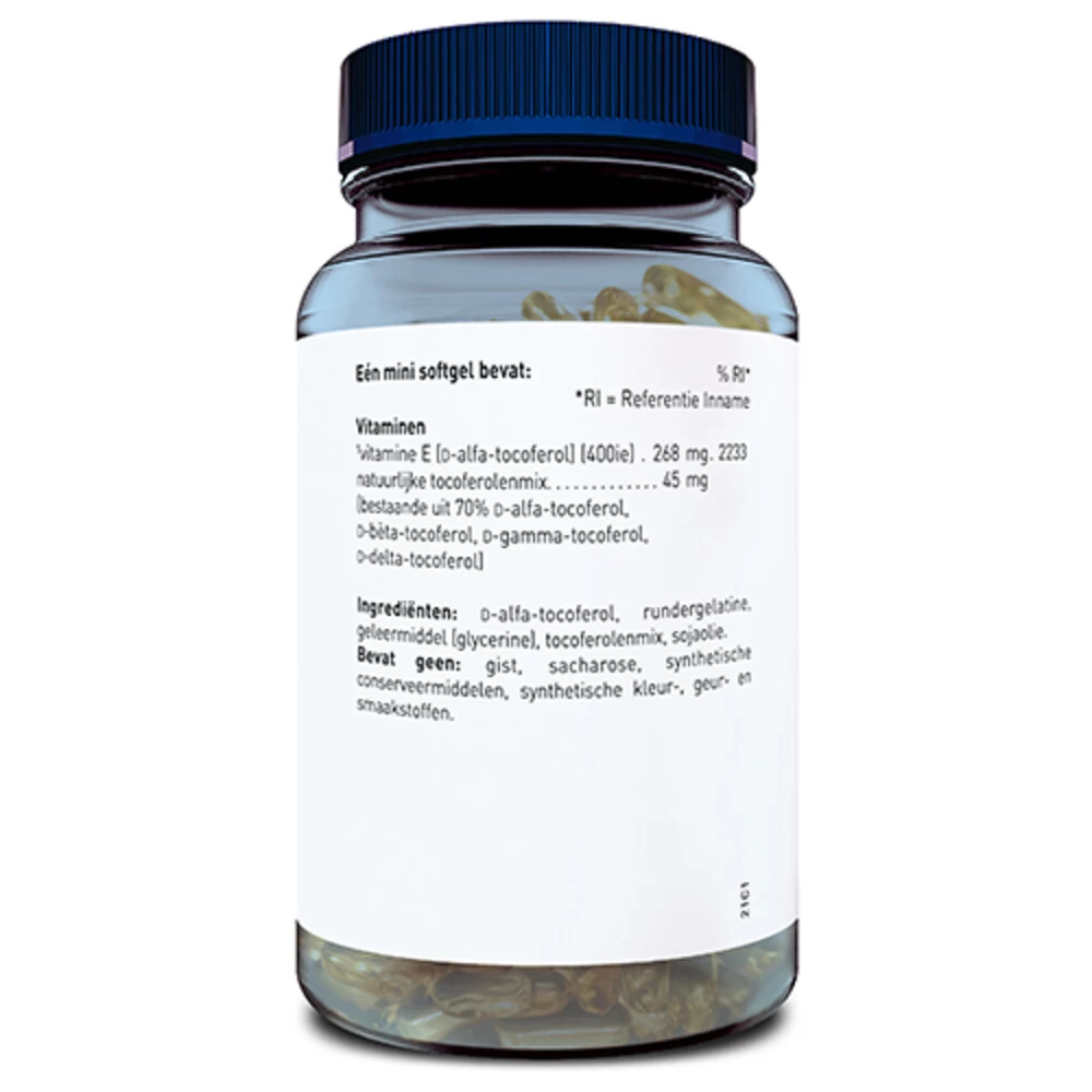 Voor behoud van gezonde cellen en weefselsVitamine E is een antioxidant ter bescherming tegen vrije radicalen en helpt lichaamscellen te beschermen tegen invloeden van buitenaf zoals zonnestralen of milieuverontreiniging.AntioxidantCelbeschermendMix van natuurlijke tocoferolenBevat geen gist, sacharose, synthetische conserveermiddelen, synthetische kleur-, geur- en smaakstoffen.De verpakking is van 100% gerecycled plastic, ofwel rPET