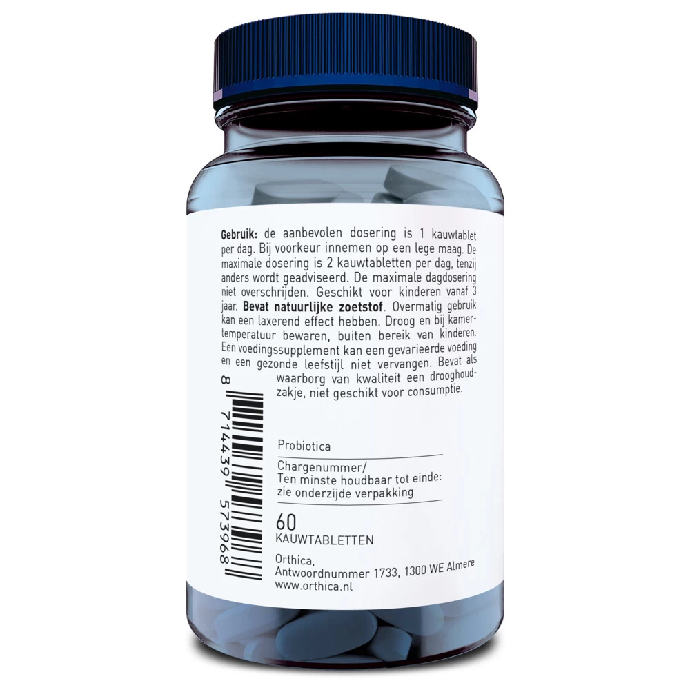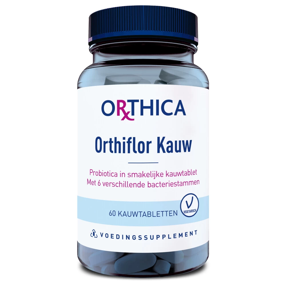 Orthica Orthiflor Kauw ProbioticaOrthica Orthiflor Kauw is een probiotica met 6 bacteriestammen waaraan vitamine D is toegevoegd. Vitamine D ondersteunt de weerstand. De bacteriestammen (Bifidobacterium animalis, Bifidobacterium bifidum, Lactobacillus acidophilus¹, – Lactobacillus acidophilus², Lactobacillus paracasei enLactobacillus salivarius) zijn in ongeveer gelijke verhoudingenDe kauwtablet heeft een zwarte bessensmaak, is gezoet met zoetstof van natuurlijke oorsprong en je kunt d