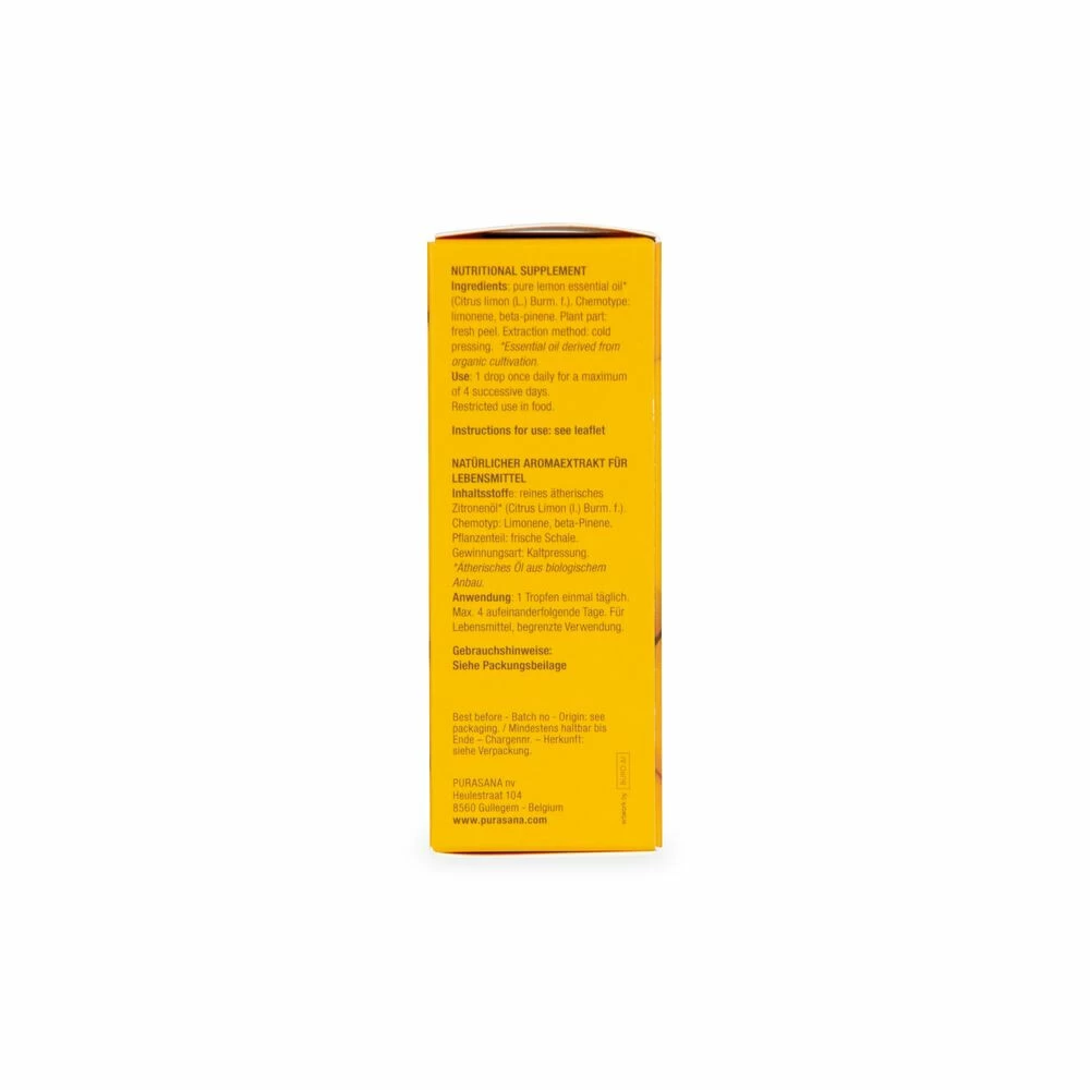 Purasana Etherische Olie Citroen Bio Citrus Limon of citroenboom is een kleine boom met grote bladeren en heeft witte bloemen die een zoete geur verspreiden. De citrusstruik staat het liefst op warme en vochtvrije plaatsen.De etherische olie van de citroen wordt gewonnen uit de verse schil via koude persing en is afkomstig uit Italie.De etherische olie van citroen kan gemakkelijk gecombineerd worden met andere etherische olien. De Citroenolie heeft een verfrissende geur en een ontsmettende