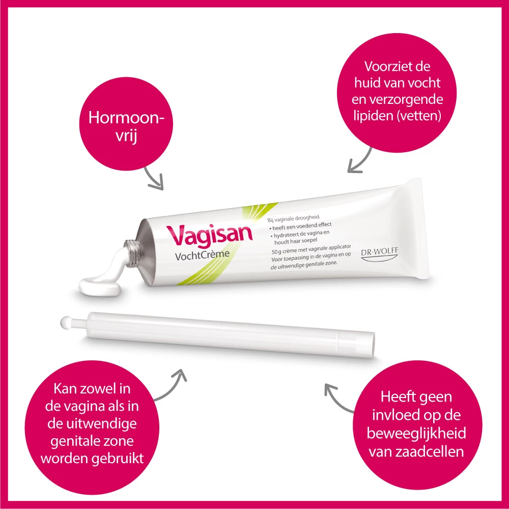 Vagisan Vochtcrème 50 mlMedisch hulpmiddel. Tijdens de menopauze of overgang neemt de activiteit van de eierstokken af en produceert het lichaam minder van het vrouwelijke hormoon oestrogeen. De wanden van de vagina en slijmvliezen van de uitwendige zone kunnen hierdoor dunner en droger worden. Deze droogheid kan trekkerig aanvoelen. Symptomen van vaginale droogheid zijn bijvoorbeeld steken, jeuk, kleine wondjes en pijn tijdens geslachtsgemeenschap. Andere oorzaken van vaginale droogheid kunnen