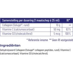 Vitakruid Collageen Solugel poeder met vitamine C & DVitakruid Collageen Solugel poeder bevat 99% puur collageen met Vitamine C en D. Collageen heeft een belangrijke samenwerking met vitamine C & D in ons lichaam. De weerstandsvitamine C draagt bij aan de vorming van collageen, wat van belang is voor een gezonde huid, gezond tandvlees en voor een gunstige werking van de bloedvaten.* Daarnaast zijn Vitamine C en D ook van belang voor de samenstelling van sterke botten, het behoud van ster