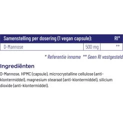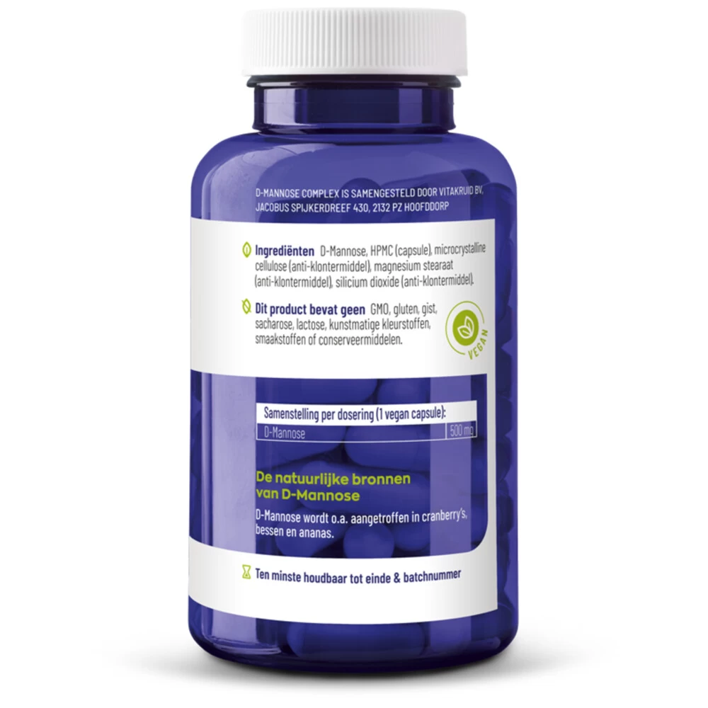 Vitakruid D-Mannose 500Vitakruid D-mannose 500 bevat een hoge dosering van de zuiverste d-mannose. Vitakruid D-Mannose 500 zit in een capsule, dit heeft zowel voordelen op het gebied van opname als smaak. Hoge dosering d-mannose per capsuleHoogwaardig extractieproces staat aan de basisEfficiënte opname door capsuleDoodt geen goede bacteriënGlutenvrij en lactosevrijVegan