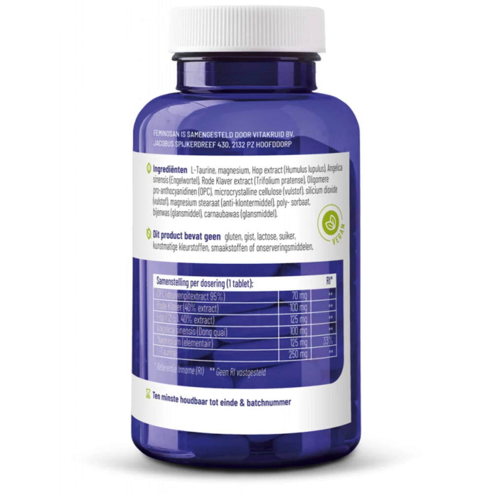 Vitakruid FeminosanVitakruid Feminosan is voor vrouwen die in de overgang komen, de overgang is een periode in het leven van de vrouw waarin de hormoonhuishouding een nieuw evenwicht moet vinden. Elke vrouw ervaart dit op een andere manier, maar lichamelijke veranderingen zijn vaak tekenend voor deze tijd. Vitakruid Feminosan is ontwikkeld om deze periode dragelijker te maken. Door het samenvoegen van hoogwaardige extracten ondersteunt deze unieke formule het overgangsproces.** Ondersteunt