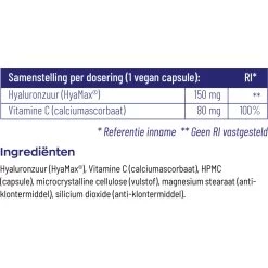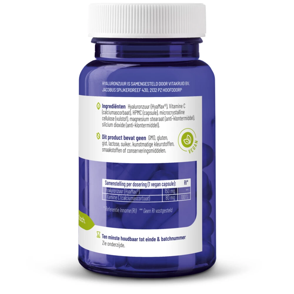 Vitakruid Hyaluronzuur 150Vitakruid Hyaluronzuur 150 houdt de huid gehydrateerd, soepel en elastisch*. Het is een voedingssupplement op basis van HyaMax® (hyaluronzuur) en vitamine C. Houdt de huid gehydrateerd, soepel en elastischVermindert de zichtbare tekenen van het ouder wordenLaag molecuulgewicht waardoor goed opneembaarGlutenvrij en lactosevrijVegan*Goedgekeurde gezondheidsclaim