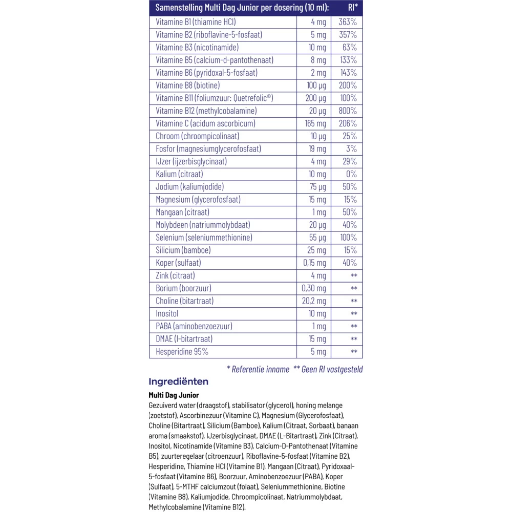 Vitakruid Multi Dag JuniorVitakruid Multi Dag Junior is een suppletie met de juiste voedingsstoffen op de juiste momenten van de dag en kan kinderen ondersteunen in hun prestaties. Zo activeert de hoge dosering vitamine B12 in de Multi Dag Junior de natuurlijke energie in het lichaam, is de vitamine C goed voor het concentratievermogen en draagt de toegevoegde calcium bij aan de zenuwfunctie. Een innovatieve formule speciaal gericht op de dag.Een complete multivitamine speciaal voor kinderen van