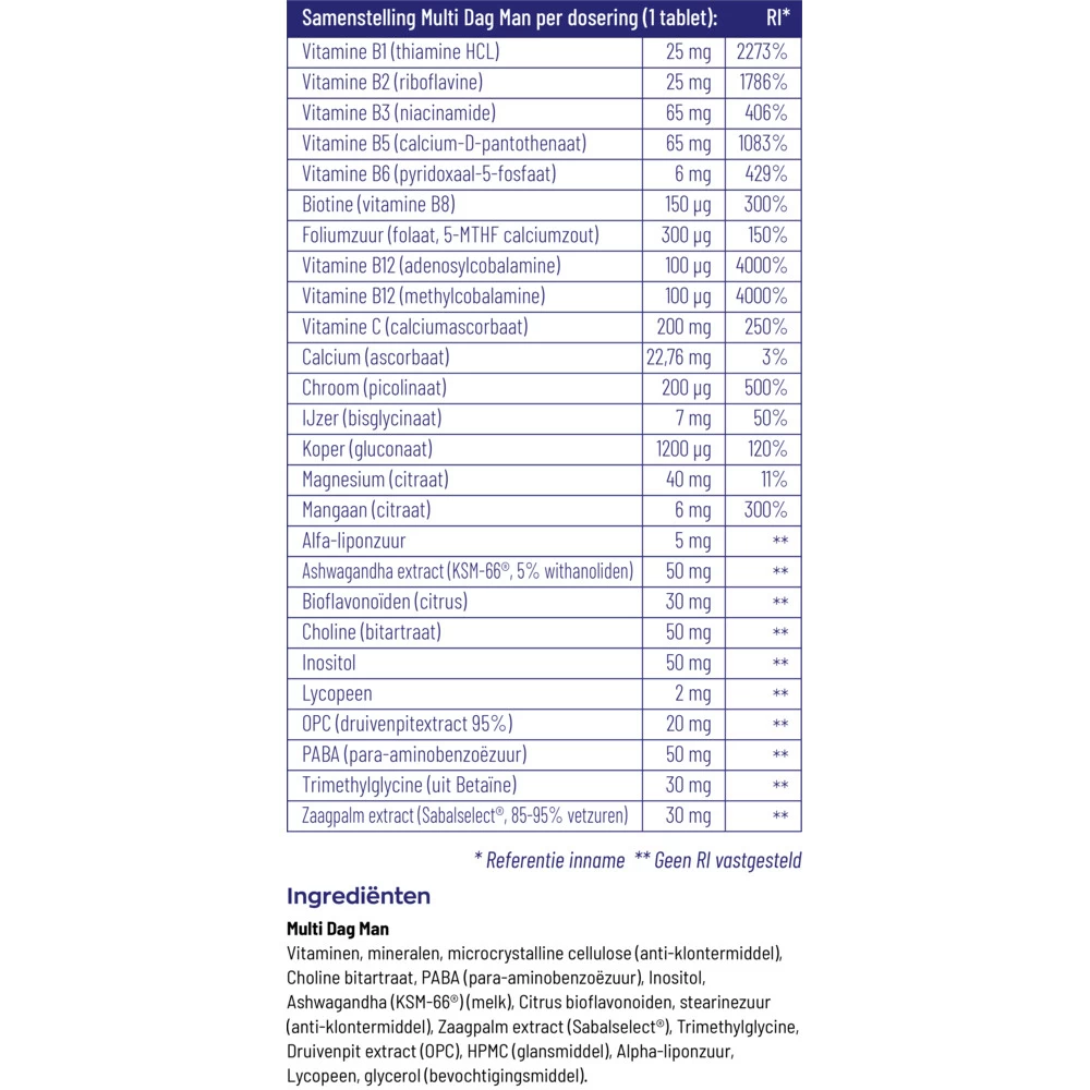 Vitakruid Multi Dag ManVitakruid Multi Dag Man bevat uitsluitend nutriënten met de hoogste biologische beschikbaarheid. Op deze manier ondervind je het meeste effect van het brede palet aan nutriënten. Multi Dag Man bevat alle B-vitaminen. Vitamine B is een natuurlijke energieleverancier. Naast B vitamines bevat Vitakruid Multi Dag Man ook Ashwagandha en Zaagpalm extract. Ashwagandha is een adaptogeen die het lichaam beter weerbaar maakt tegen stressvolle situaties**. Zaagpalm extract