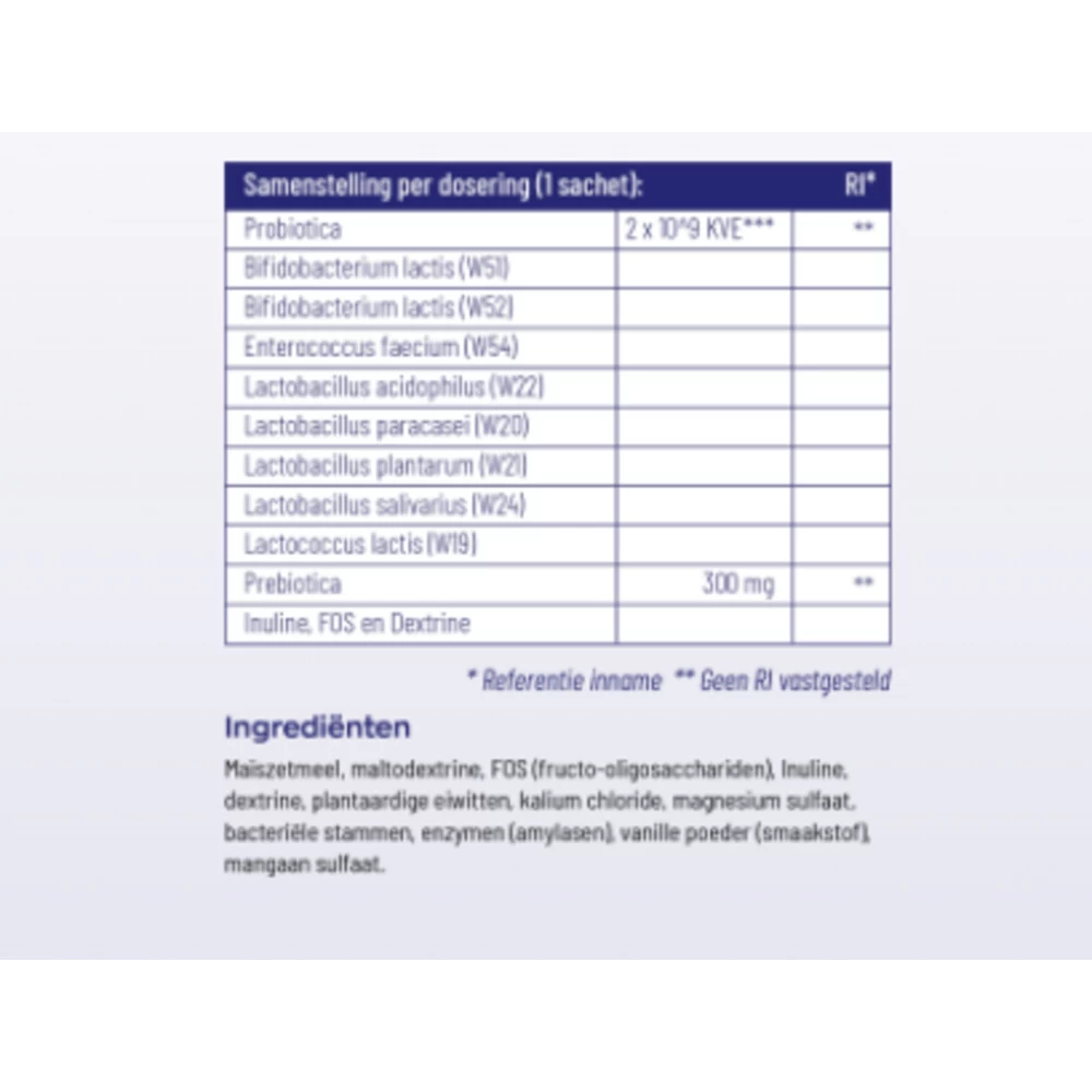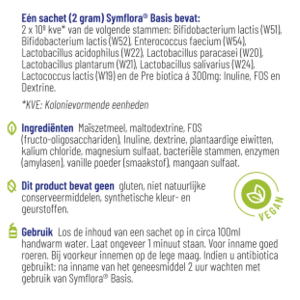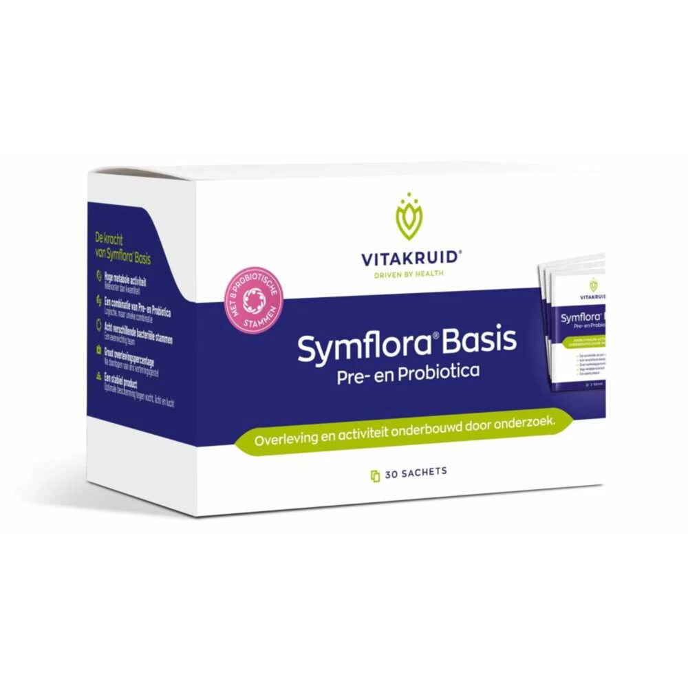 Vitakruid Symflora BasisVitakruid Symflora Basis bevat 8 verschillende bacteriële stammen. Uit onderzoek blijkt dat een probioticum met meerdere stammen effectiever is dan een probioticum met slechts één stam. Je kunt het zien als een team van mensen met verschillende achtergronden, die elkaar kunnen helpen en aanvullen door hun verschillende kwaliteiten. Daarom is bij Symflora Basis gekozen voor een formule met maar liefst acht stammen. Door Symflora Basis te verpakken in sac