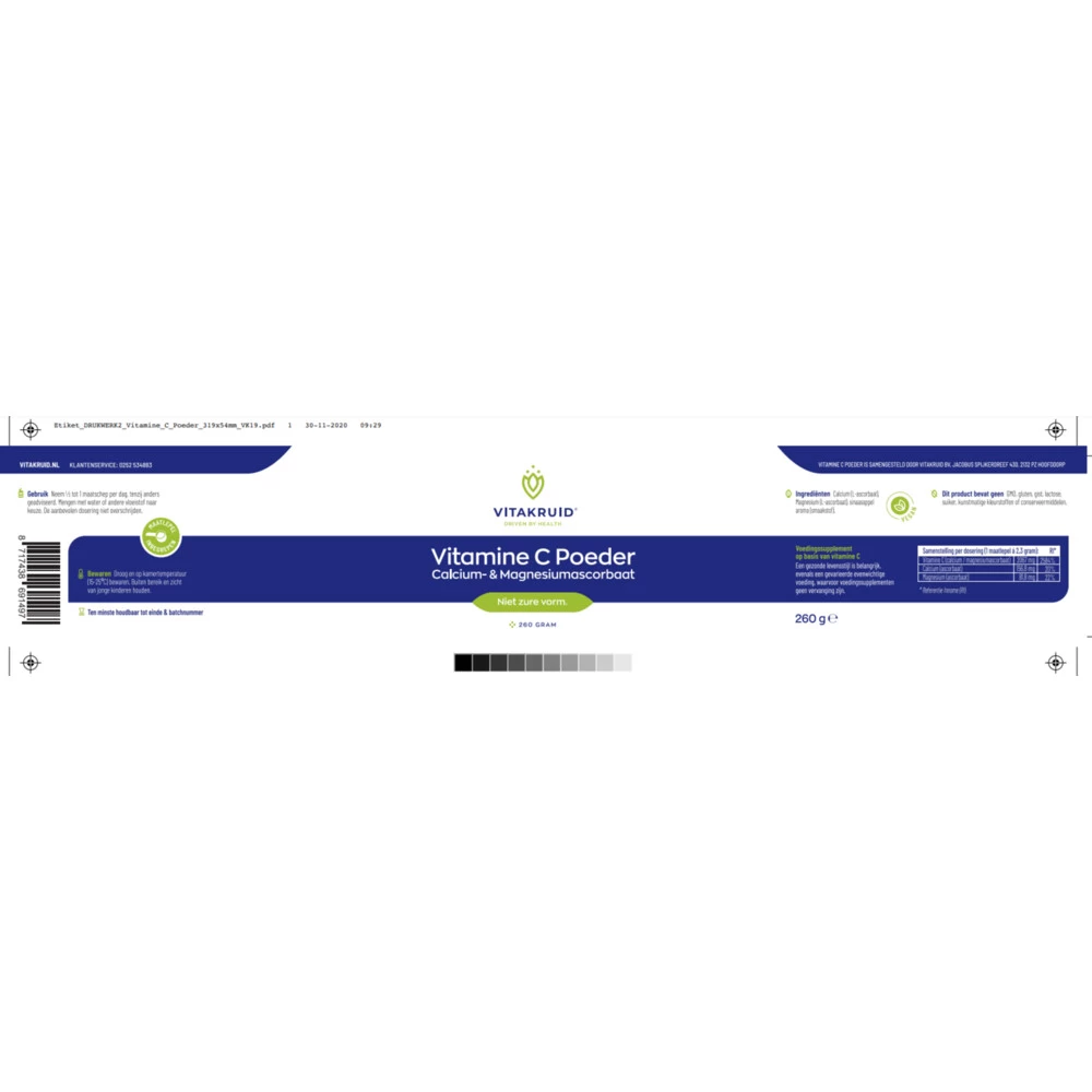 Vitakruid Vitamine C Poeder Calcium- & MagnesiumascorbaatVitakruid Vitamine C Poeder Calcium- & Magnesiumascorbaat bevat 2067 mg vitamine C. Vitakruid Vitamine C Calcium- & Magnesiumascorbaat poeder is een ascorbaat gebonden aan calcium en magnesium. Deze vorm draagt het label ontzuurt en is dus uiterst vriendelijk voor maag en darmen. Vitakruid Vitamine C Calcium- & Magnesiumascorbaat is goed mengen en te doseren door het bijgeleverde maatschepje. De ontzuurde vorm van vita