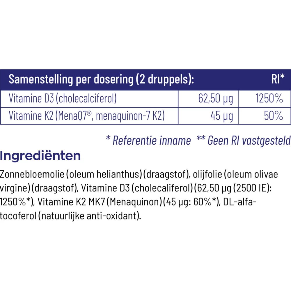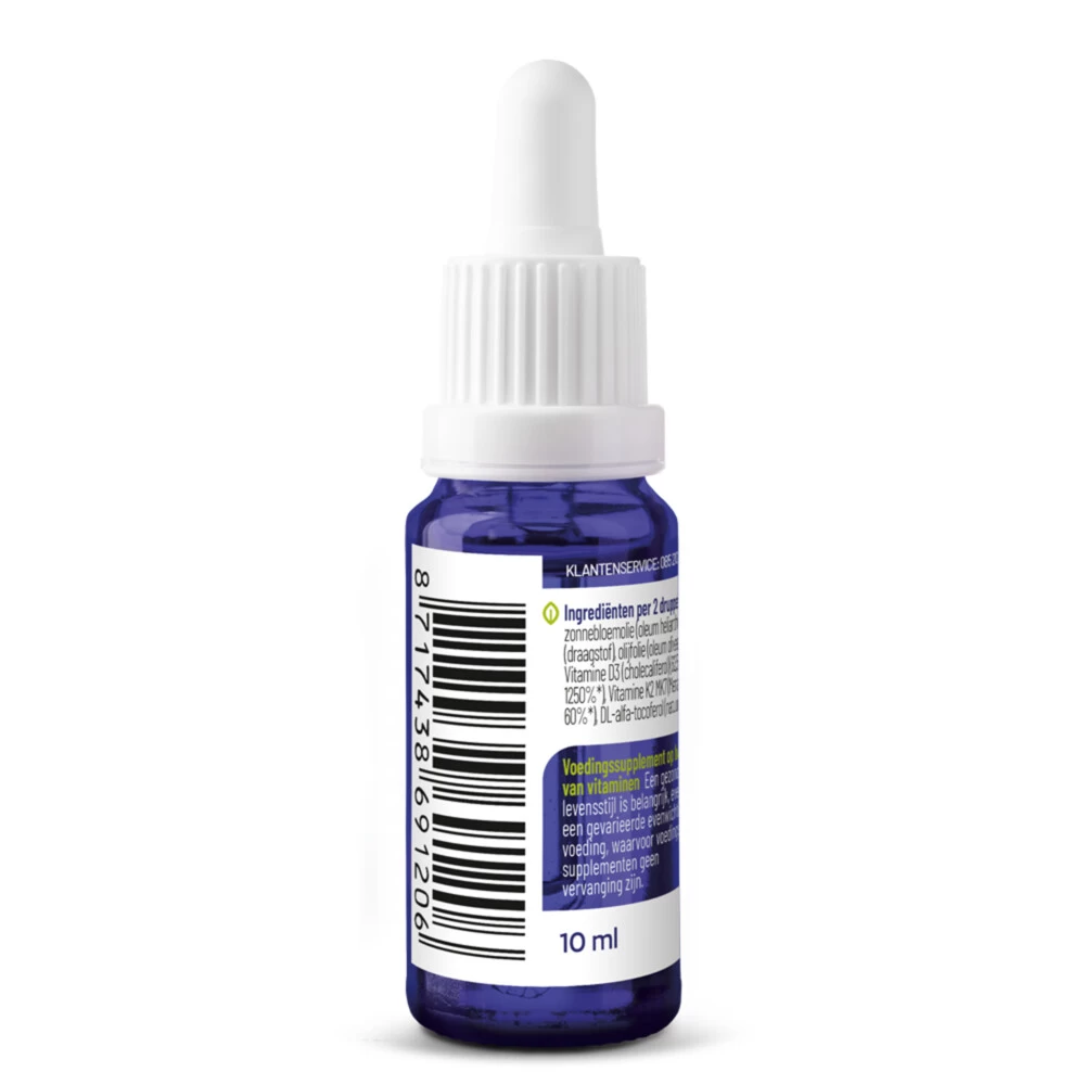 Vitakruid Vitamine D3&K2Vitakruid Vitamine D3&K2 heeft de beste vormen vitamine D3 en K2 (MenaQ7®) en bevat maar liefst 62,50 µg vitamine D3 per dagdosering. K2 & D3 is belangrijk bij een gezonde calciumstofwisseling*, Vitamine D3 is o.a. goed voor de weerstand, botten, tanden en spieren*. Vitakruid Vitamine D3&K2 is eenvoudig te doseren naar individuele wensen. De vulstof in Vitakruid Vitamine D3&K2 is zonnebloemolie. Zonnebloemolie geschikter dan olijfolie.*Goedge
