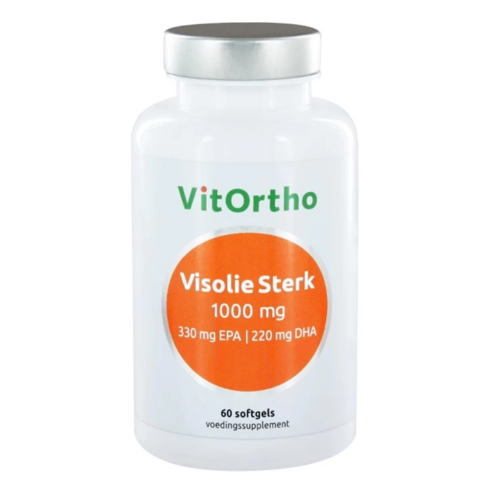 Vitortho Visolie 1000 mgVitortho Visolie Sterk 1000mg 330mg EPA | 220mg DHA is een geconcentreerde visolie met positieve eigenschappen voor de gezondheid. EPA en DHA, aanwezig in hoge doseringen, dragen bij aan een goede werking van het hart. Daarnaast is DHA ook goed voor de hersenfunctie en het gezichtsvermogen.