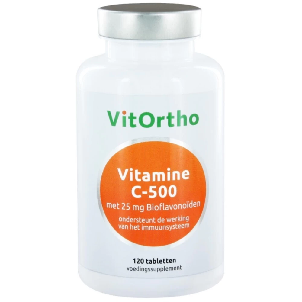Vitortho Vitamine C500 25 mg BioflavonenVitortho Vitamine C-500 met 25mg Bioflavonoiden is een vitaminesupplement. Vitamine C is een zeer belangrijke vitamine voor het lichaam en draagt ook bij aan een tal van lichaamsprocessen. Vitamine C draagt bij aan de collageenvorming, maar is ook een belangrijke vitamine voor de huid en het kraakbeen. Daarnaast ondersteunt het de werking van het immuunsysteem en het zenuwstelsel. Ook is vitamine C een hulpzame vitamine voor het verminderen van vermoeidhei